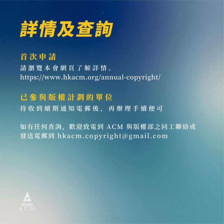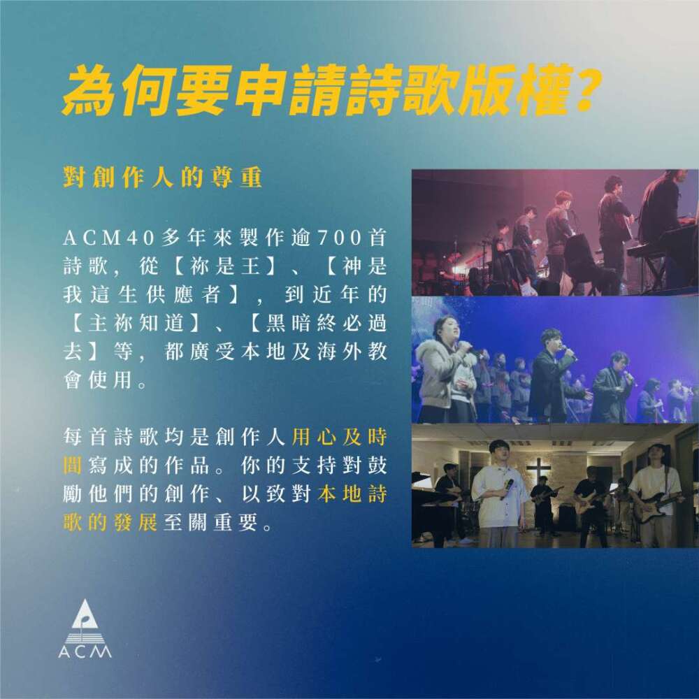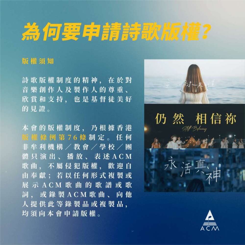 【ACM版權年費申請呼籲©】再次感謝教會、學校、機構、弟兄姊妹們多年嘅支持、使用我哋嘅詩歌,並向ACM申請詩歌版權。大家的支持對我哋同創作人黎講是很大很大的鼓勵.《ACM詩歌版權申請》在此呼籲,如教會、學校、機構在聚會地址內展示、放映、複製版權屬ACM管理之歌曲的歌譜/歌詞,請 #申請年費計劃,除了方便大家使用ACM詩歌,此舉亦是對版權的尊重、以及對創作人的肯定。有大家的支持,ACM的詩歌創作及事工將有更長久的發展!===================================================================================ACM 40多年來製作逾700首詩歌,從【祢是王】、【神是我這生供應者】,到近年的【主祢知道】、【黑暗終必過去】等,廣受本地及海外教會使用。我們致力創作詩歌,盼能繼續祝福本地及海外信徒。.若為首次申請,請瀏覽本會網頁了解詳情及申請。https://www.hkacm.org/annual-copyright/已參與版權計劃的單位,待收到續期通知電郵後,再辦理手續便可。其他用途的版權申請,請瀏覽本會網頁。https://www.hkacm.org/copyright/如有任何查詢,歡迎致電到 ACM 與版權部之同工聯絡或發送電郵到 hkacm.copyright@gmail.com。