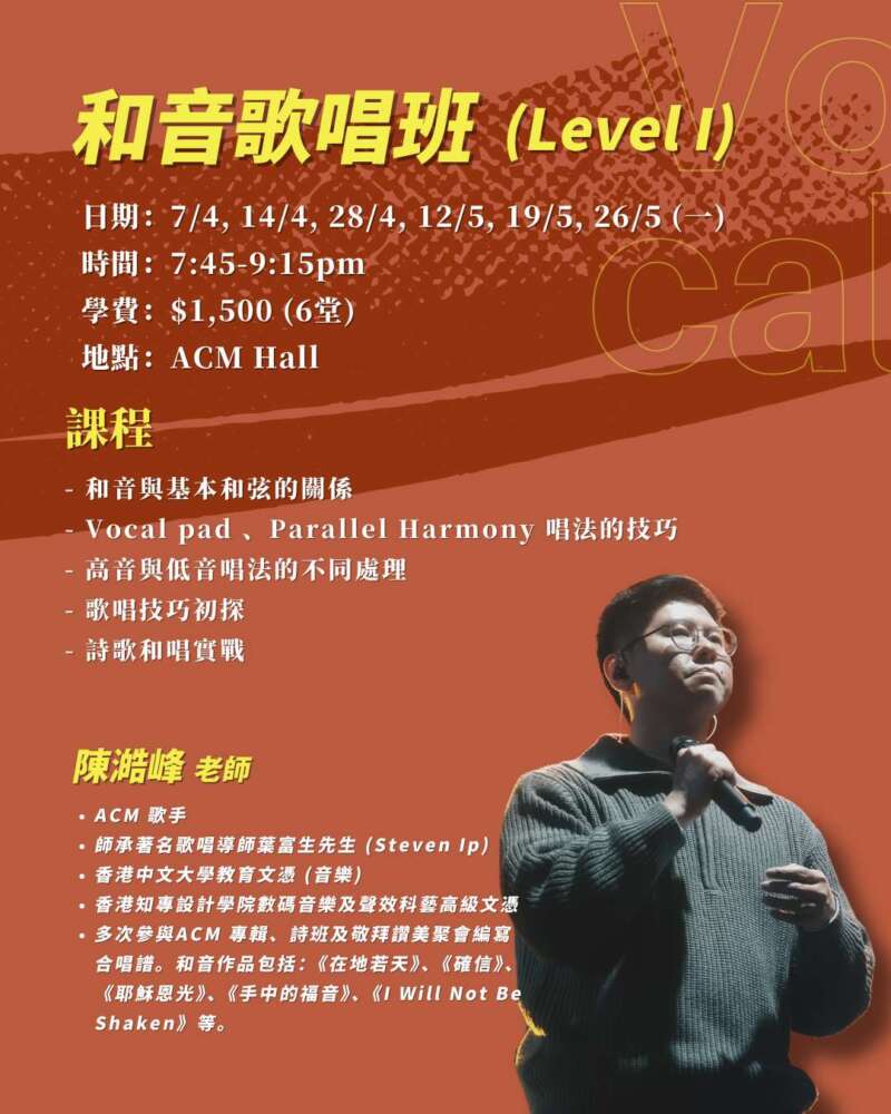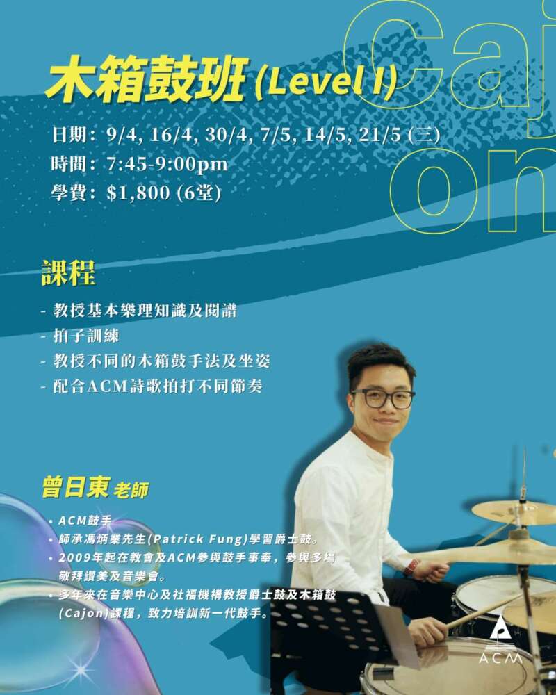 ACM鼓手 曾師承馮炳業先生(Patrick Fung)學習爵士鼓 2009年起在教會及ACM參與鼓手事奉,曾參與多場敬拜讚美及音樂會 曾氏多年以私人開授、在音樂中心及社福機構教授爵士鼓及木箱鼓(Cajon)課程,致力培訓新一代鼓手。