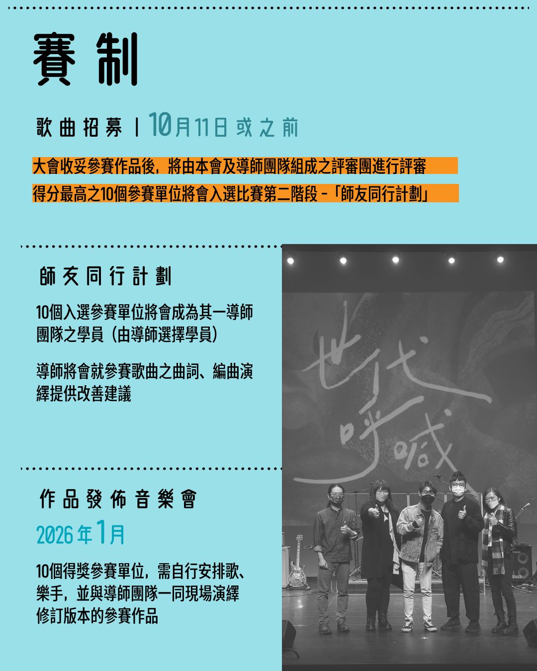 - 10個得獎參賽單位,需自行安排歌、樂手,並與導師團隊一同演繹其最終版本的參賽作品。