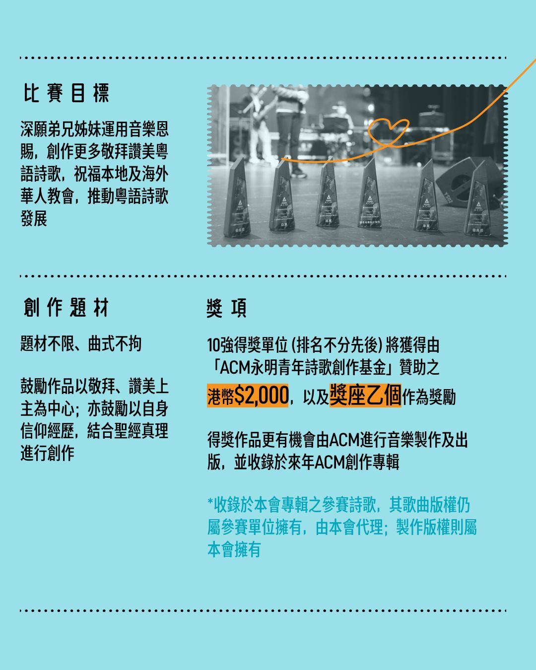 是次比賽由「ACM永明青年詩歌創作基金」贊助,希望延續本會的傳統及使命,鼓勵及推動基督教音樂創作,培育新一代創作人。本會亦鼓勵會眾以奉獻支持本會及新一代創作人創作粵語詩歌。