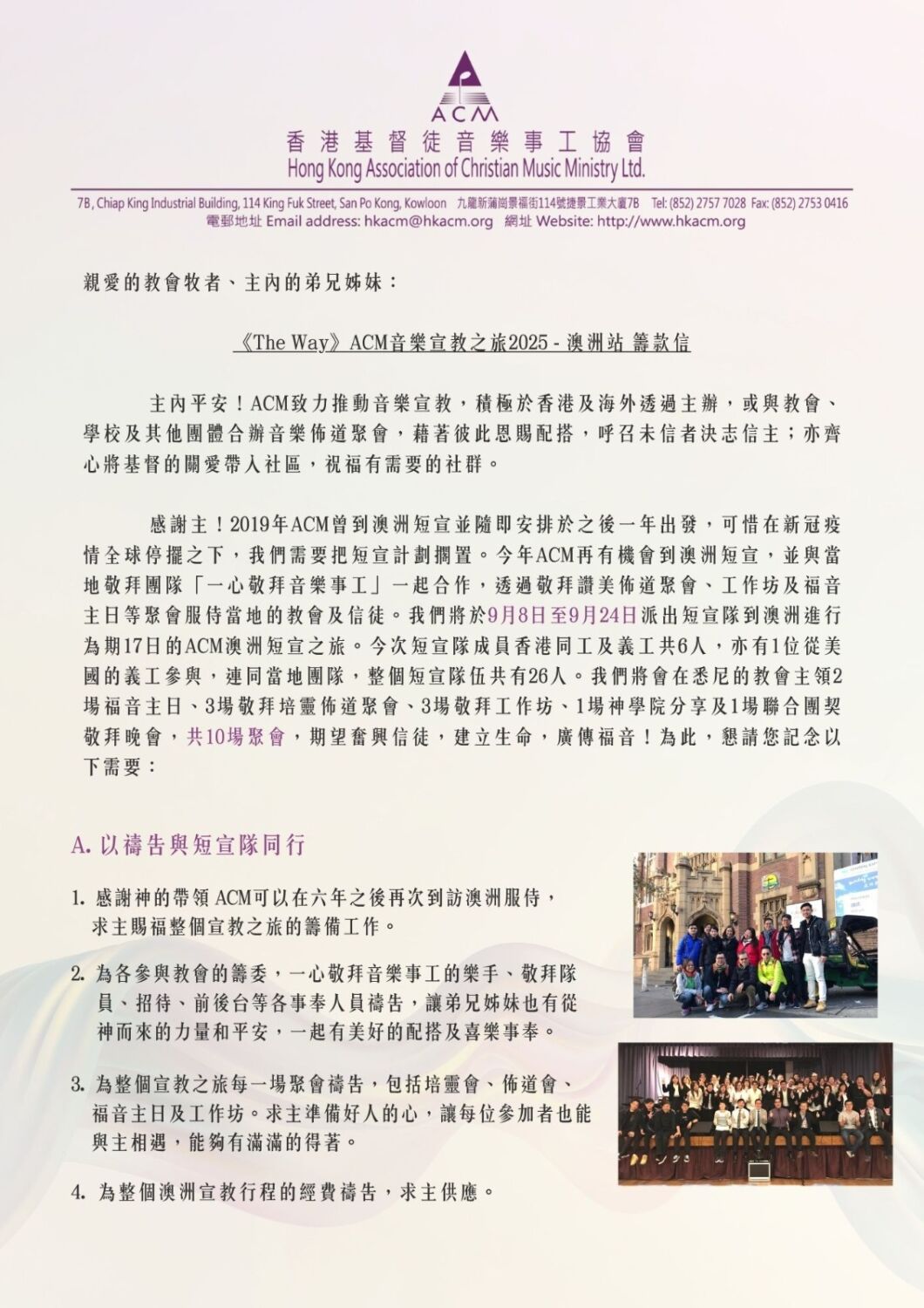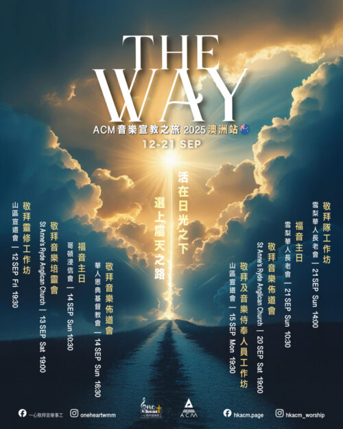 ACM將於 9月8日至9月24日到澳洲展開音樂宣教之旅,並與當地敬拜團隊 One Heart Worship & Music Ministries (一心敬拜音樂事工) 一起開展為期17日的宣教服侍,在多間教會分別主領2場福音主日、3場敬拜培靈佈道會、3場敬拜工作坊、1場神學院分享和1場聯合團契敬拜晚會,共10場聚會,期望奮興信徒,建立生命,廣傳福音!