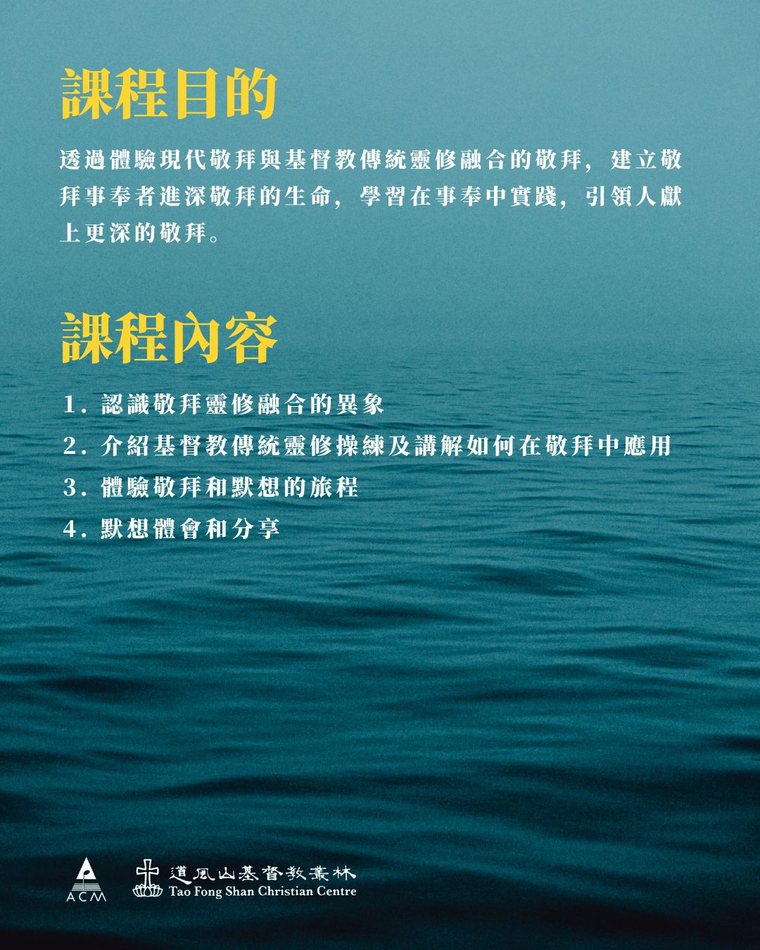 - 介紹基督教傳統靈修操練及講解如何在敬拜中應用